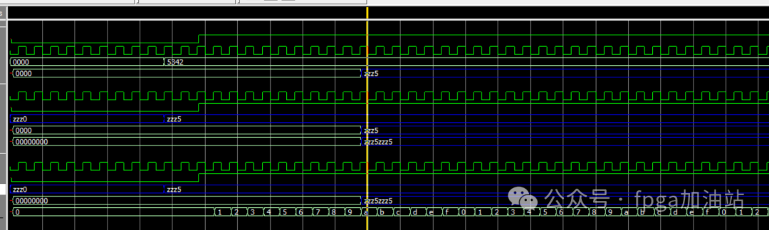 在模块例化的过程中,有时候会遇到这样一种情况:例化模块端口信号位宽和相连的信号位宽不一致。就像下面的代码所示:gen_data为被例化的子模块,其被例化到了top模块中。在测试文件(testbench)中,只把data_in的15、14、13、12位送给了gen_data模块的data_i。gen_data模块的data_i接收到的值应该是16hzzz5,如图1所示。详细点说,就是tb文件中的data_in的15、14、13、12位分别对应的是gen_data模块中data_i的3、2、1、0位。