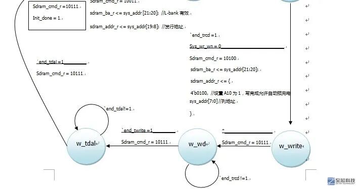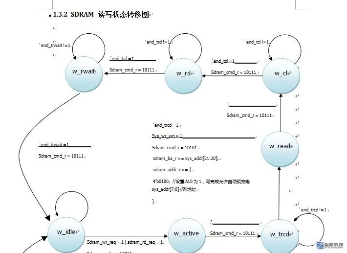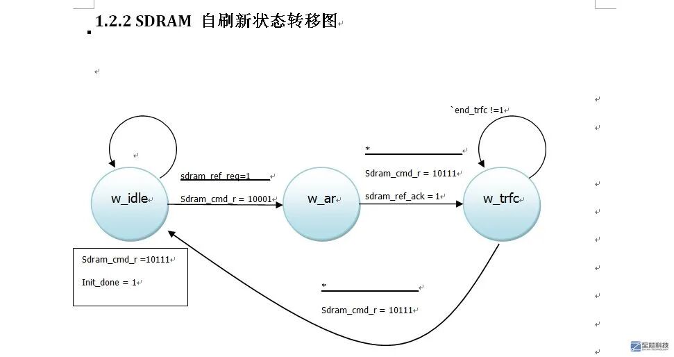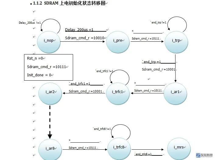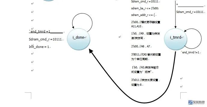 当初始化结束的时候,标志位init_done置位,告诉工作状态机,初始化状态机已经结束,进入工作状态。下面是我用word做的上电初始化的状态转移图