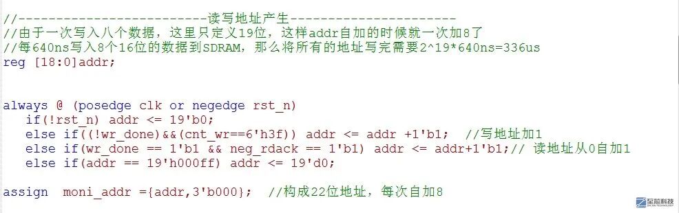 1、 首先我们需要发送读写地址对吧,但是我们需要有一个间隔,即每隔一段时间发送一次写地址,为什么呢?因为我们之前在模式寄存器配置的时候,定义了突发读写的长度为8,也就是我们发送一个地址,那么sdram会在连续的8个地址中连续写8次数,我们如果要再发送地址,需要等到这8次地址写完之后再发送下一个地址这个延时大概为640ns,也就是计数器为什么要计到3f的原因,下一个地址的发送就需要比之前的地址大8了,比如第一次我发送的是0地址,那,隔一段时间之后,我就需要发送8地址了。