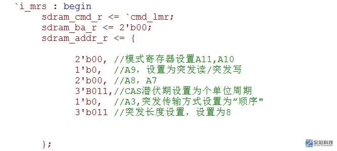 到了模式寄存器的配置阶段,我们需要选定L_bank,以及SDRAM工作模式的配置,当sdram_cmd模块检测到初始化状态机到达模式寄存器配置阶段时,我们的给SDRAM的sdram_bank端口赋相应的值,并且设置地址总线