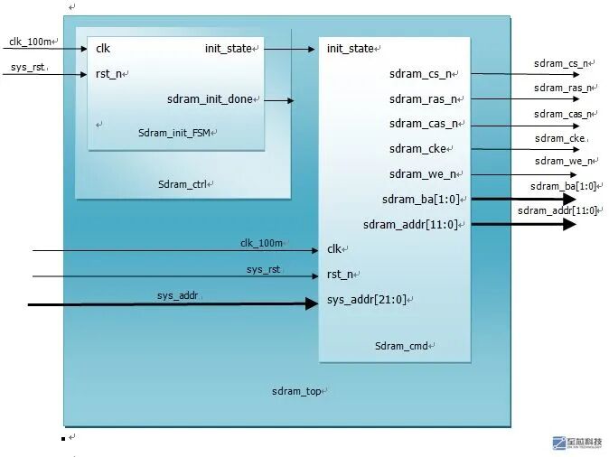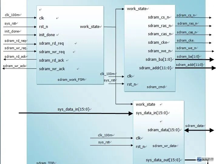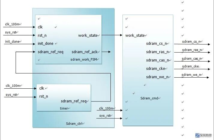 初始化结束以后,SDRAM就处于工作状态,每15us进行一次自刷新,这个时候,如果想要读或写数据的话,即向工作状态机sdram_work_FSM发送读写请求,如果是读请求,那么工作状态机进入行有效状态,也即激活状态w_active,此时,sdram_cmd模块会发送行有效命令,即CMD_ACTIVEA