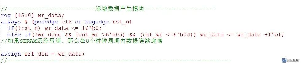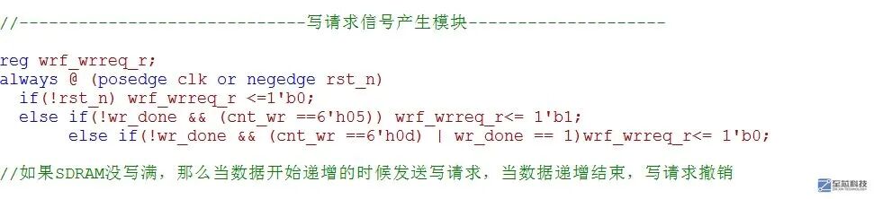 3、在发送递增数据之前,我们需要发送写请求信号,这个写请求信号是要发送到我们接下来要讲的FIFO里面,发送写请求之后,数据进入FIFO,注意,这里的写请求是发送给FIFO的,不是发送到SDRAM的,SDRAM的写请求是由FIFO发出去的