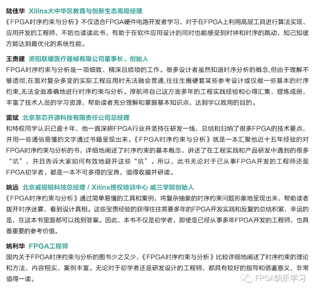 非常钦佩特权同学在繁忙的工作之余,继续为社区广大FPGA爱好者提供如此“干货”的学习资料,对于真正想了解FPGA设计、优化FPGA设计的读者而言,认真地掌握和理解这些约束是大有裨益的。这本书不仅适合FPGA硬件电路开发者学习,对于在FPGA上利用高层工具进行算法实现、应用开发的工程师,不妨也读读此书,有助于在软件应用设计的同时也能感受到时钟和时序的跳动,知己知彼方能达到最优化的系统性能。