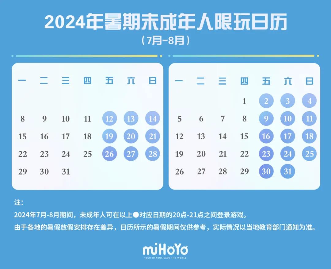 米哈游于今年6月20日在成长关爱平台发布了“2024年暑期未成年人限玩日历”,显示暑期未成年人可于每周五、六、日的20点至21点之间登录游戏,其余时间均为禁玩时段。同样,腾讯游戏6月26日发布的“暑期限玩日历”也显示,暑假两个月中,未成年人可玩游戏时间仅23小时。