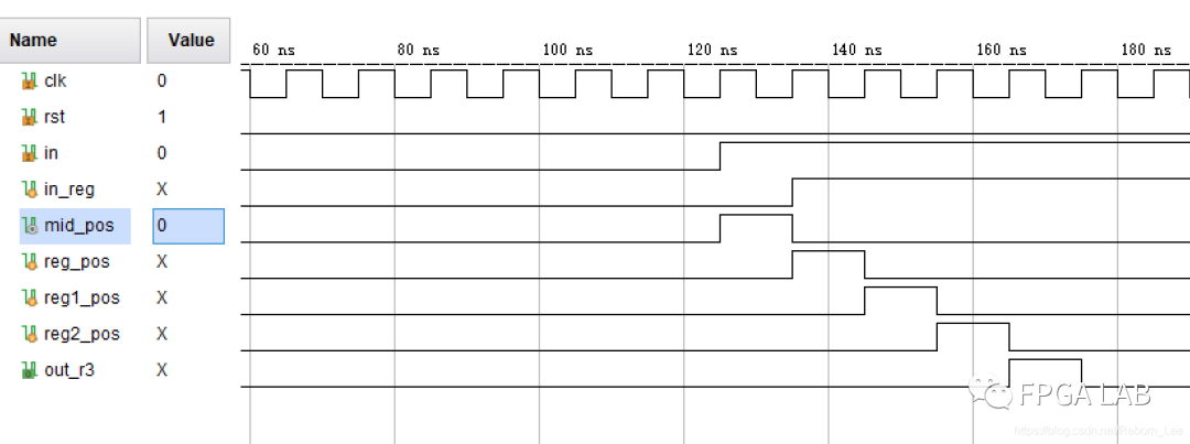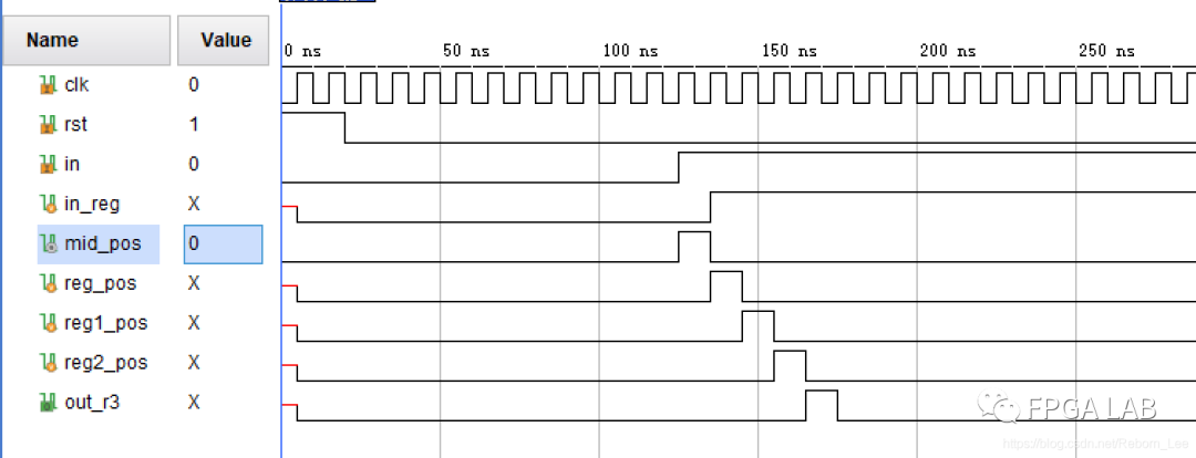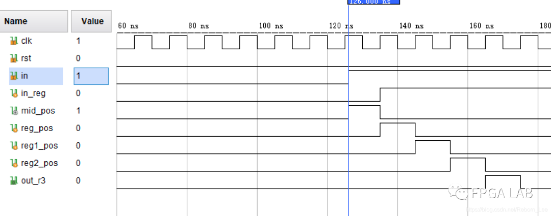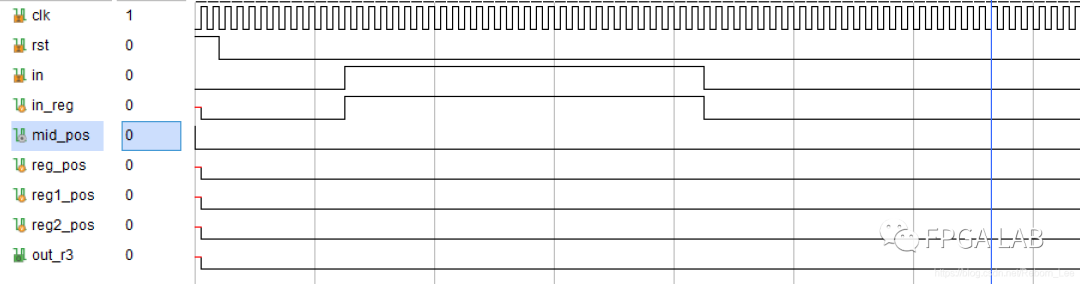 可见,得不到上升沿,这我们其实也能理解;由于是行为仿真,所以,一切都是理想的,不考虑延迟;我们使用阻塞赋值在时钟上升沿时刻给输入赋值,立即生效;固然,我们的时钟在上升沿采样的时候,得到in_reg和in是同边沿的,这样自然就得不到边沿了,后面延迟多拍也自然无用。