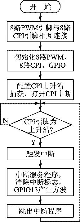 通过DSP操作控制看门狗逻辑模块寄存器,看门狗能够正确运行,并能够正确影响复位模块以验证看门狗IP模块。通过DSP正确操作CPI等寄存器,使CPI模块产生中断并发送至DSP,DSP能够正确响应中断信号进行及时处理。为了方便验证CPI功能,此SoC验证CPI模块把PWM产生波输入到CPI模块,配置CPI捕获模式,当CPI模块输入有变化时,进行捕获产生中断。当发生中断时,CPI_INT为高电平,当DSP处理后会变为低电平信号。验证方法原理如图4所示。