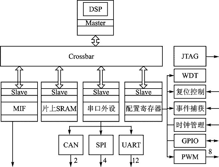 1基于DSP核控制的SoC系统本文设计的SoC系统采用国内自主研发DSP核,主要包括: DSP处理器核、片上AXI总线、PWM、事件捕获器、看门狗控制、中断控制器、复位管理、存储模块、I/O以及其他外设(UART、CAN、SPI等)模块。这些模块与DSP核之间通过AXI总线连接,进行数据通信。AMBA AXI的总线协议具有高性能、支持高频传输、高速亚微型系统互连的特征,为主从结构,一切触发都由主设备发起。核间通信总线采用SoC系统中应用最多的AXI总线结构,比较灵活,可满足对带宽需求不同的各种IP。