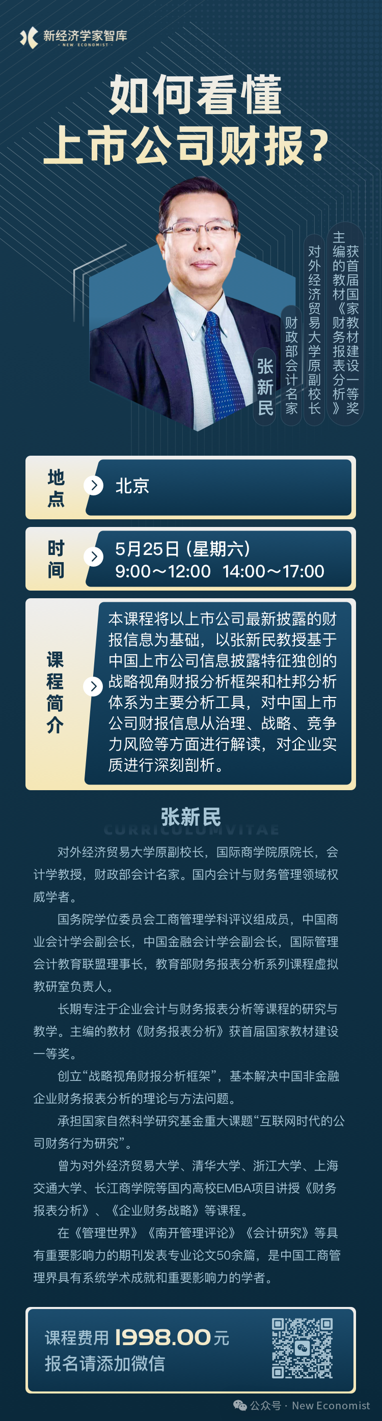 5月25日,新经济学家智库将邀请财政部会计名家、对外经济贸易大学原副校长张新民老师在北京线下授课,帮助以财经媒体工作者为代表的,对细致分析企业财报有需求的读者群体,快速掌握分析财报的有效框架。